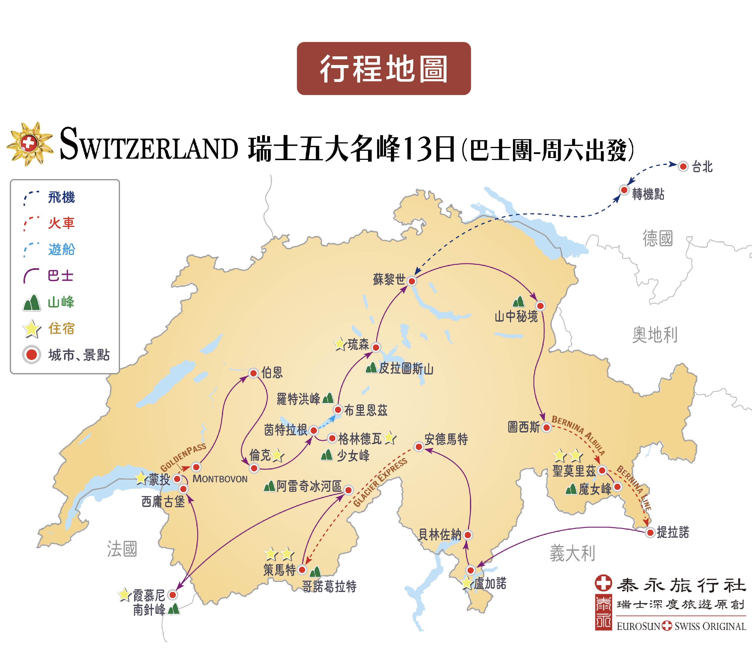 4. 報名瑞士航空/國泰航空之行程,如需要改由高雄小港機場自行出發,請在報名時與您的業務提出需求。無法只更改單程,高港高航班時間以航空公司回覆為主,無法保證有機位,敬請見諒。