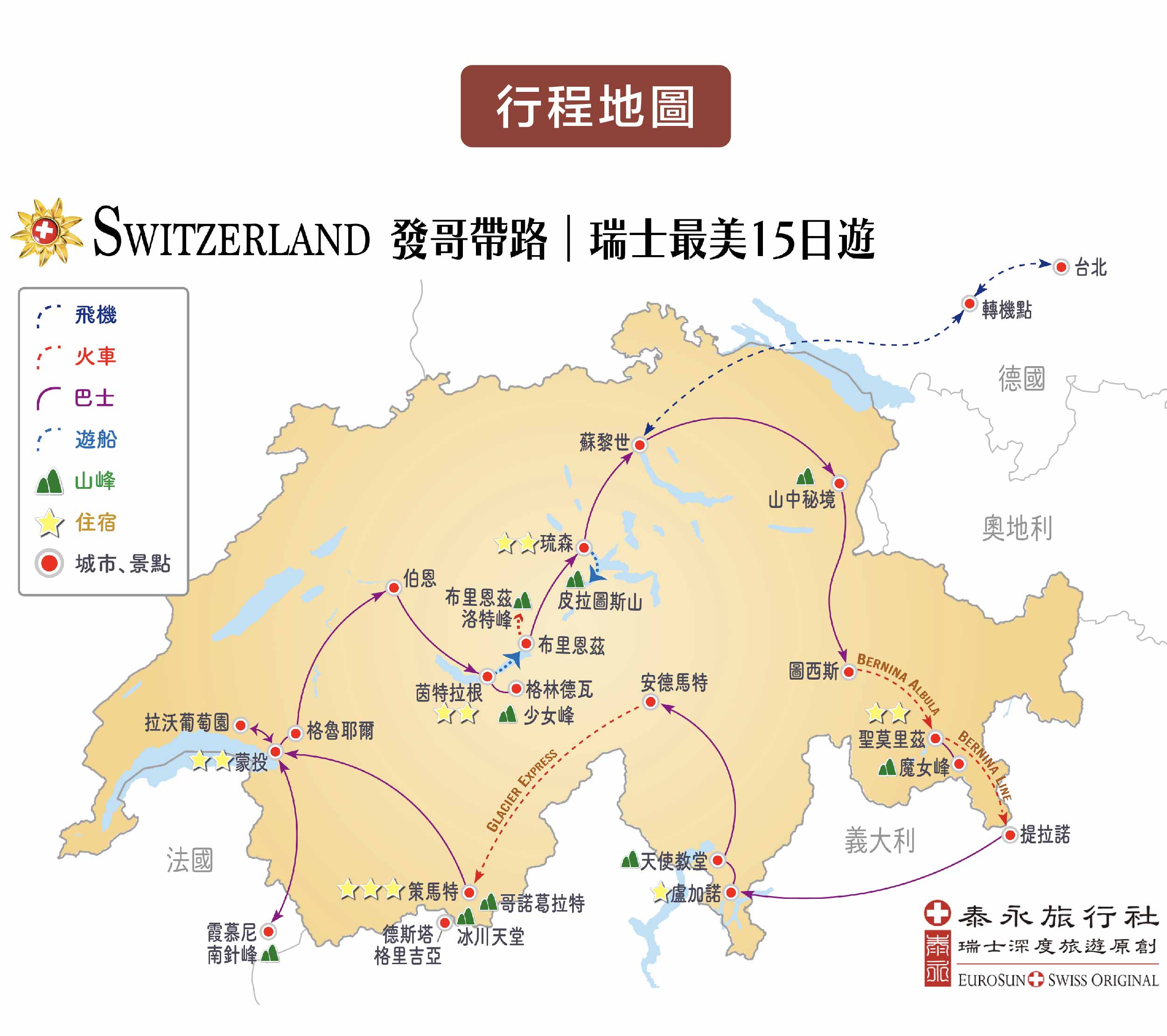 不含項目:不包含台北-蘇黎世來回機票;如需代訂請洽泰永旅行社。