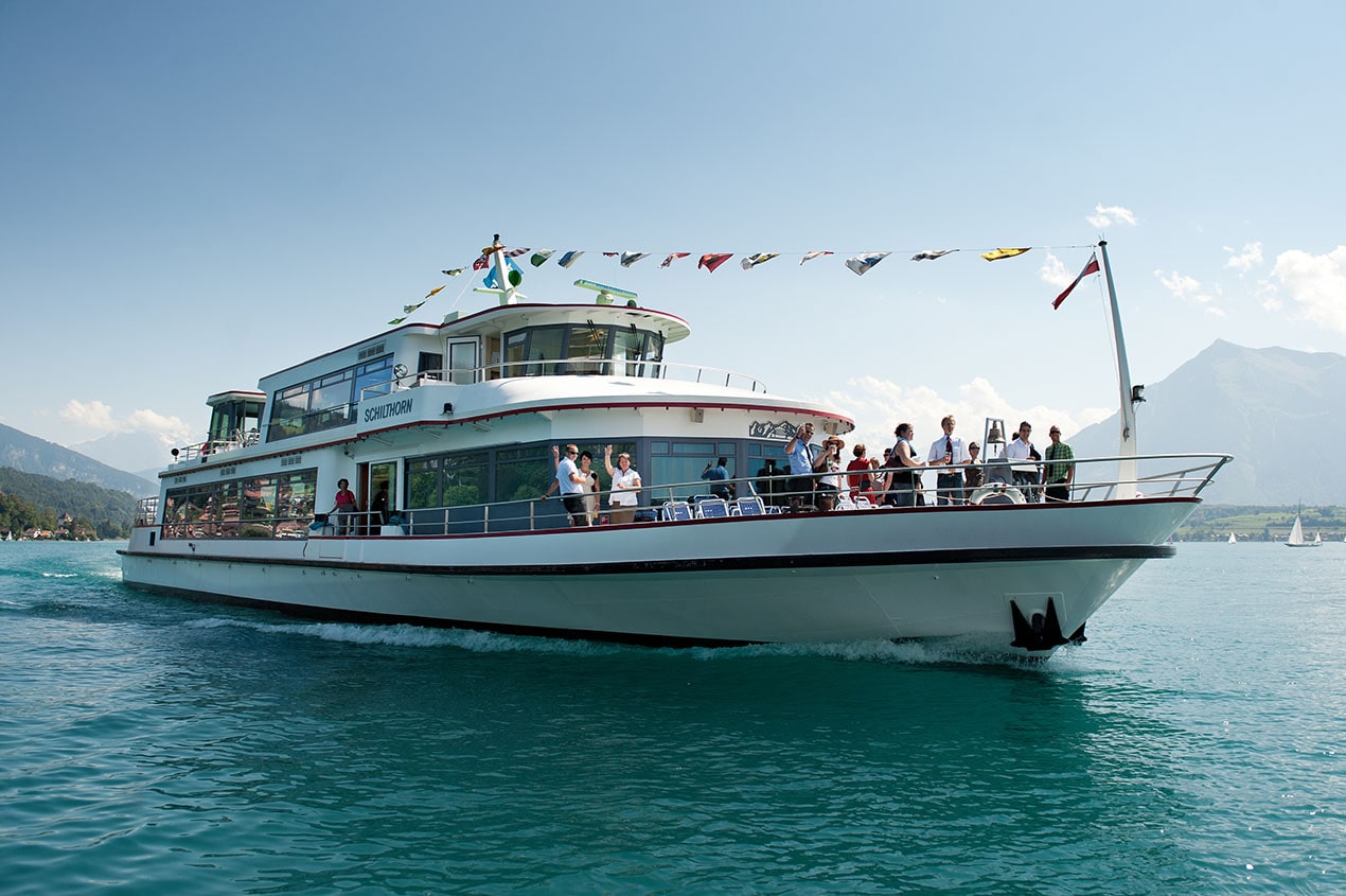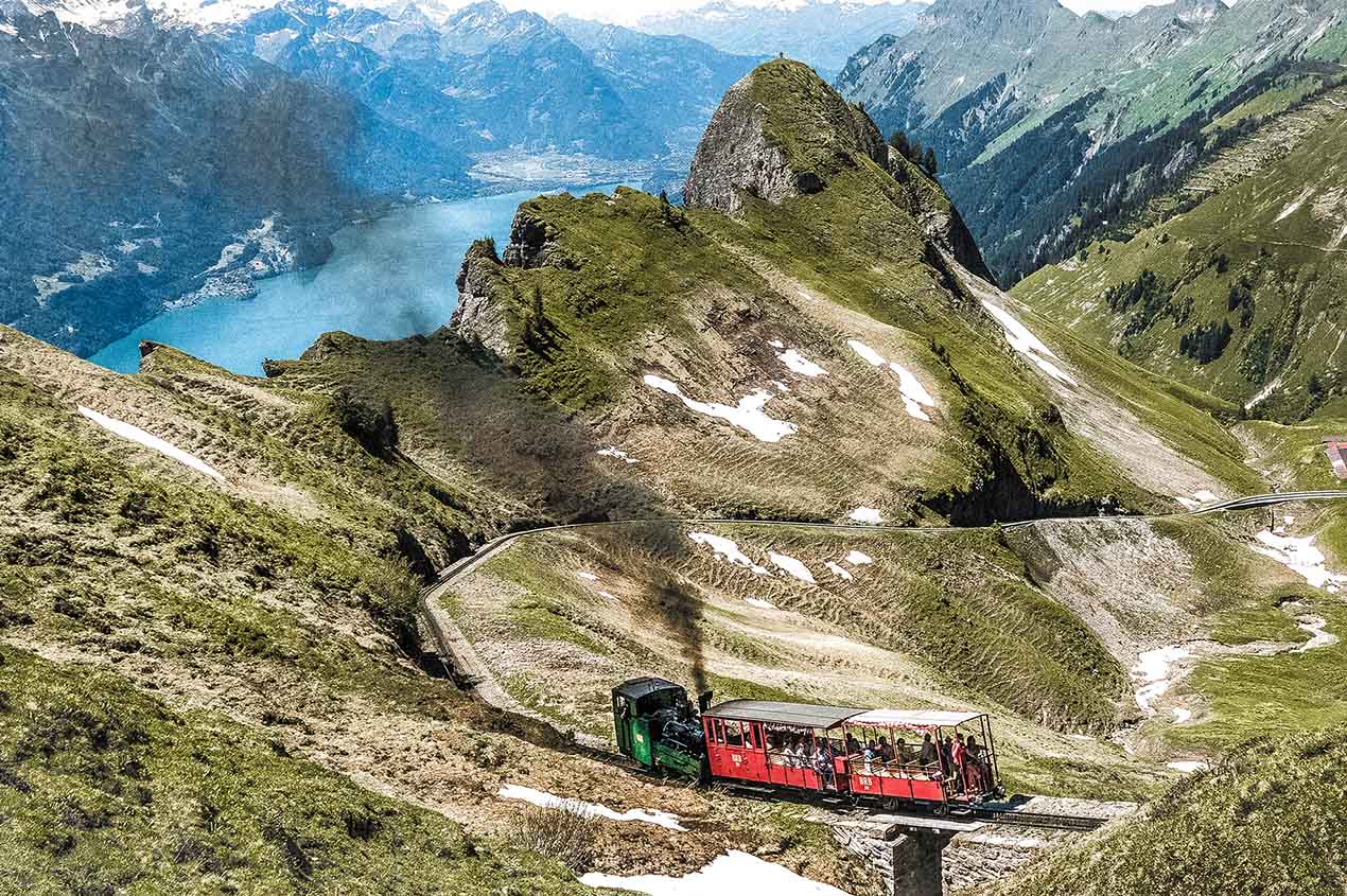 布里恩茲羅特洪峰海拔2,350公尺,在茵特拉根搭船,行駛在瑞士湛藍的布里恩茲湖上,再轉搭百年蒸汽齒軌登山火車,緩緩穿行於翠綠的山坡與群山之間,透過開放式車廂感受蒸汽火車的懷舊氛圍,俯瞰壯觀的布里恩茲湖。