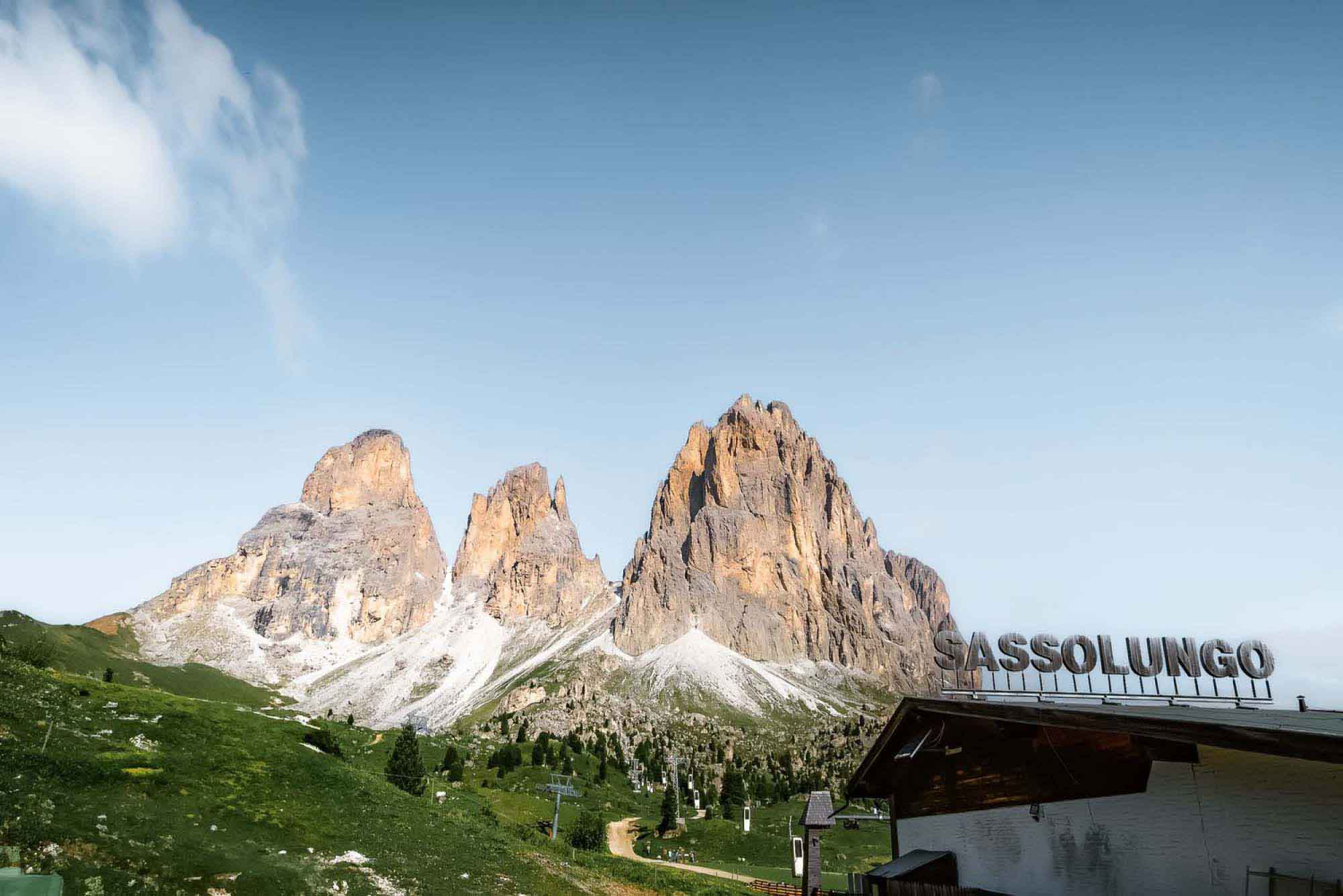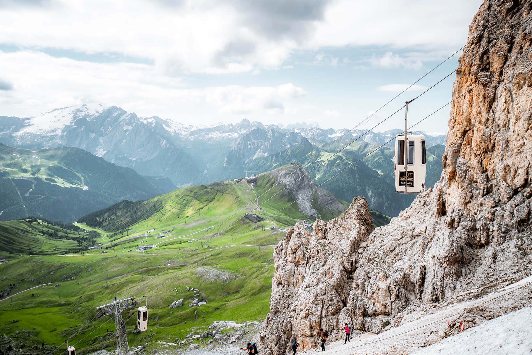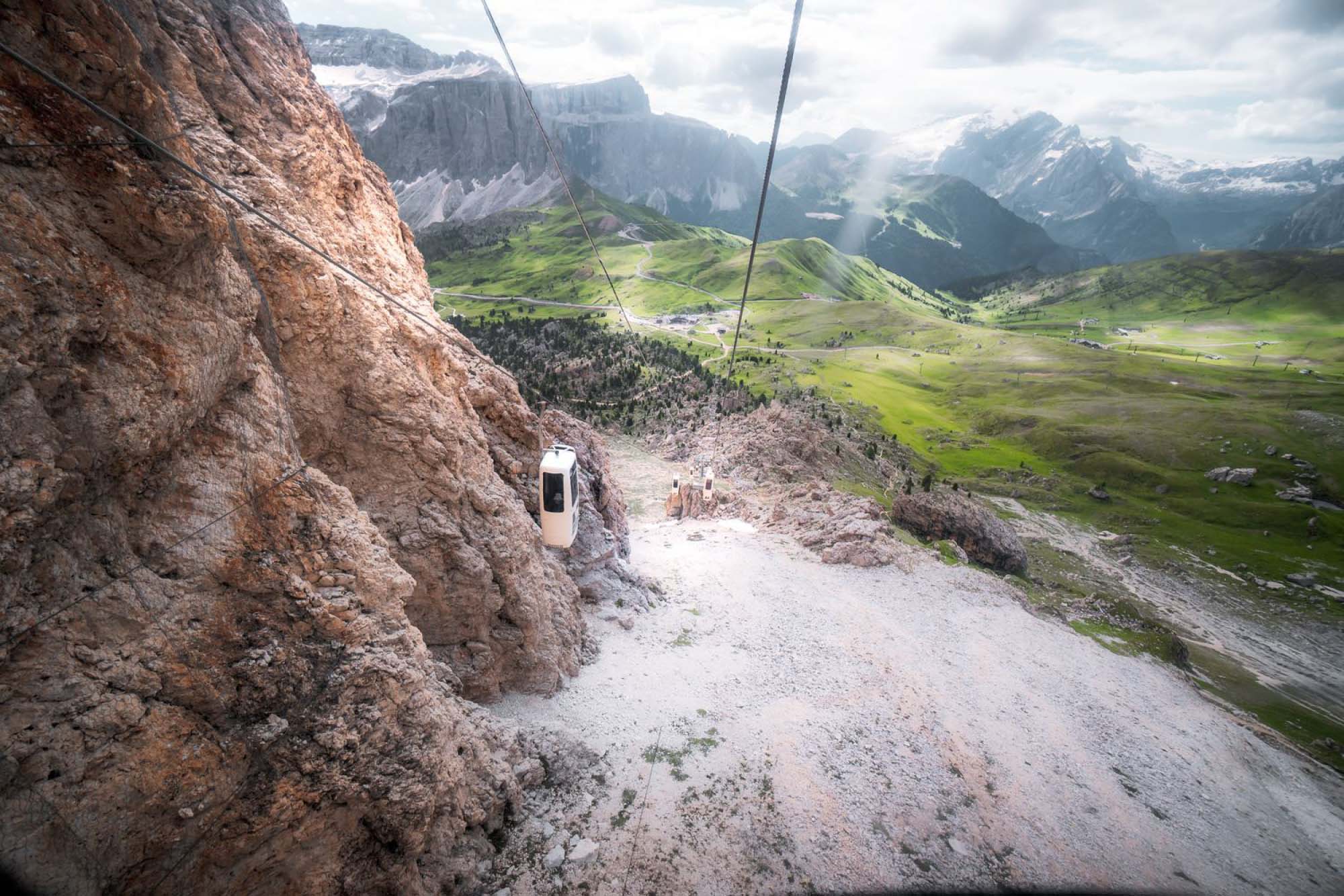 通往山區的纜車自Passo Sella出發,直達海拔約2,685公尺的山鞍Forcella del Sassolungo。此段纜車採用開放式立式吊籃設計,乘客需站立搭乘,隨著纜索貼近岩壁上升,迅速由山口上升至高山地形,沿途景觀由開闊草坡逐步轉為岩壁峽谷。抵達山鞍後可置身群峰環繞的空間之中,近距離觀察白雲岩岩層結構,並銜接周邊健行路線或山屋停留,是多洛米蒂少見兼具交通與體驗性的登山方式。