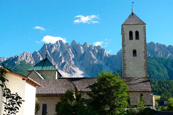 位於聖坎迪多(San Candido)鎮中心,原為 8 世紀建立的本篤會修道院,後於 12 世紀改制為學院教堂,延續宗教功能至今。現存建築以結構嚴謹的羅馬式風格聞名,外觀樸實而莊重,厚實的石牆、對稱的立面與半圓拱門,體現羅馬式建築重視比例與結構的美學。內部保存多件中世紀壁畫與祭壇藝術,呈現宗教信仰與藝術創作並行發展的歷史樣貌,使整座建築不僅是宗教場所,也是一處珍貴的歷史與藝術見證。
