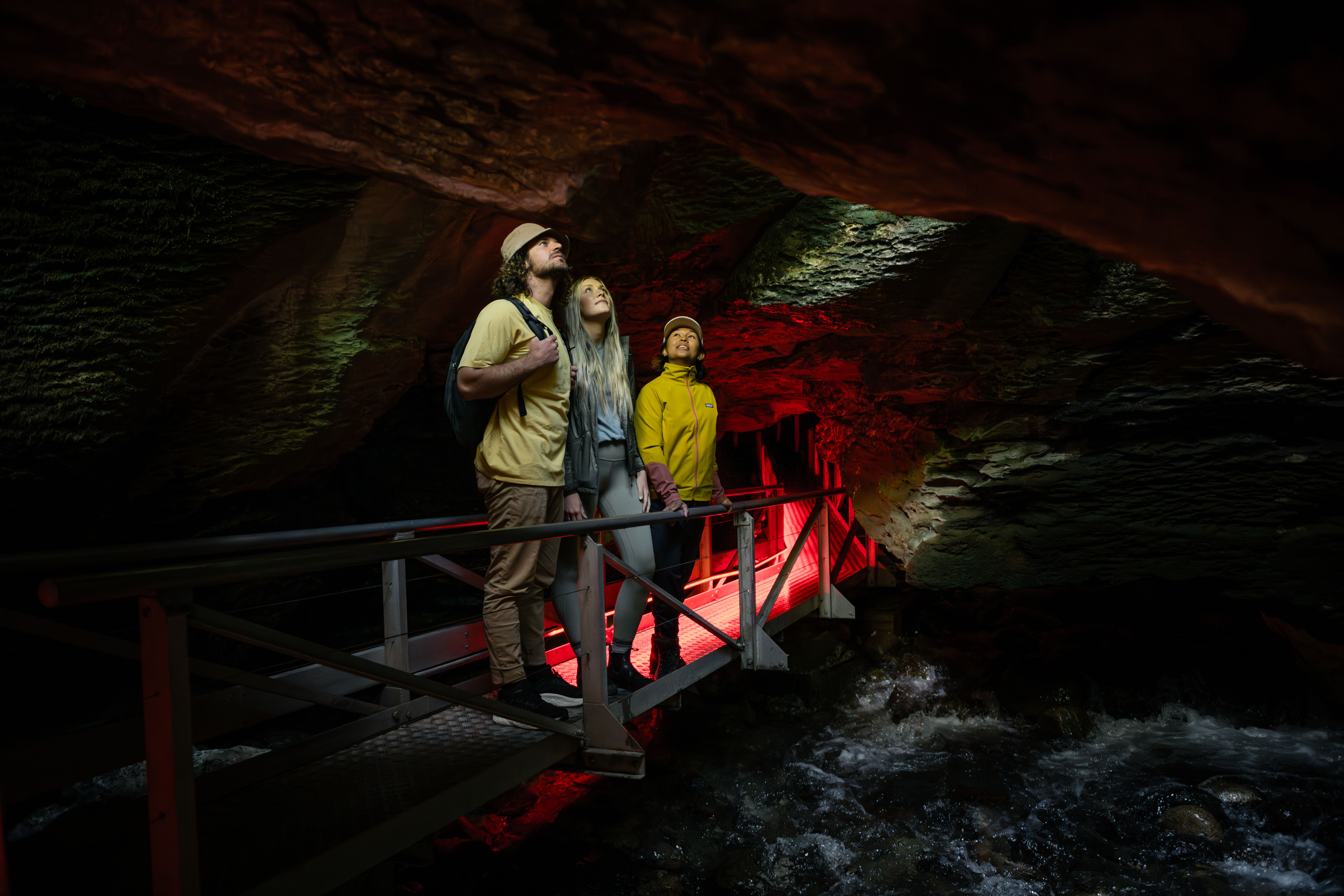 洞內棲息著紐西蘭特有的洞穴螢火蟲,發光的其實是幼蟲,它們懸掛在洞頂,拉出細長的黏性垂絲,以藍綠色微光吸引飛蟲落入陷阱,彷彿在漆黑洞穴點亮一片幽藍星河。由於螢火蟲對環境極為敏感,洞內維持恆溫、恆濕、無光無噪,是全球少見能近距離觀察螢光生態的天然場域。