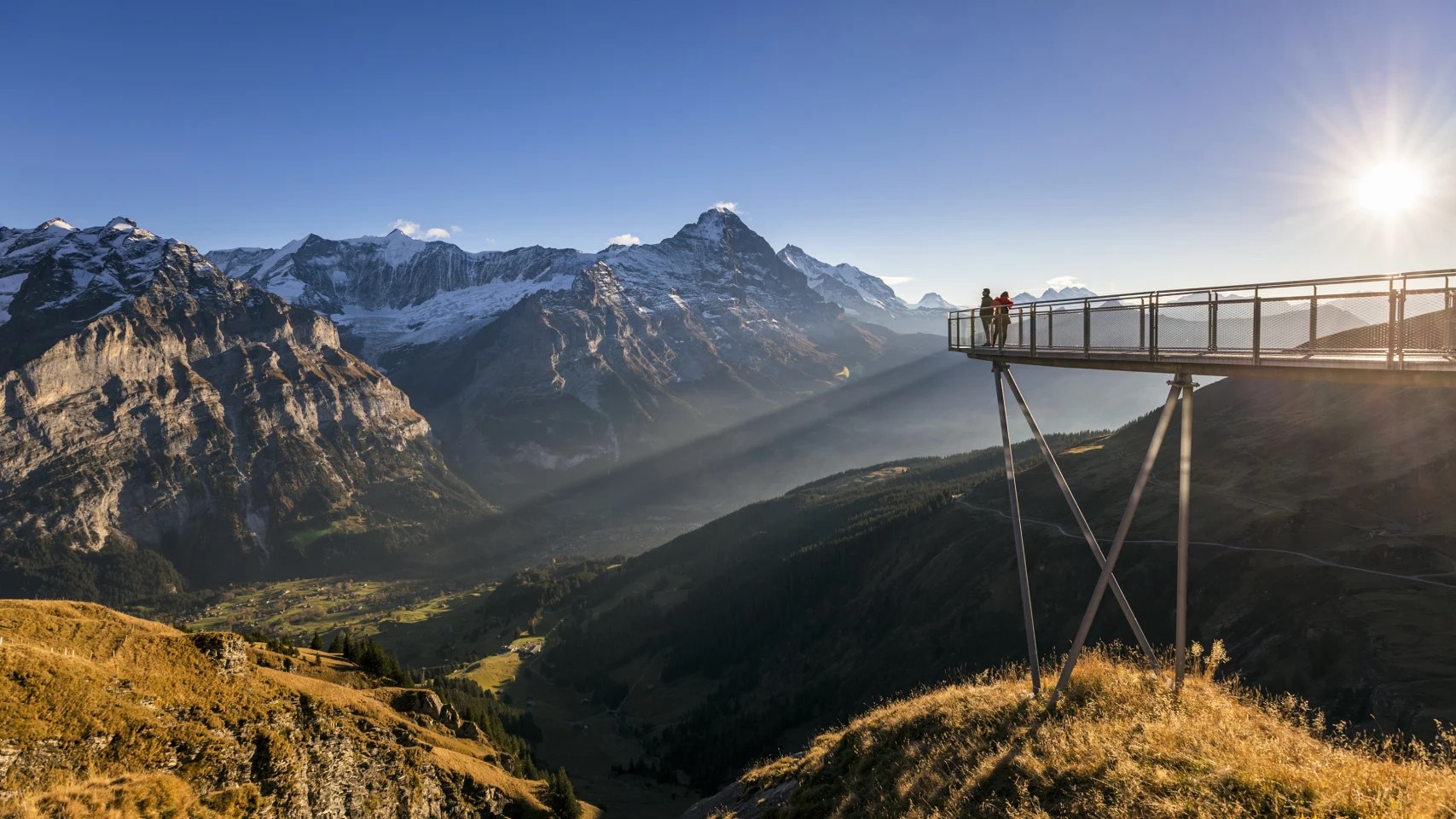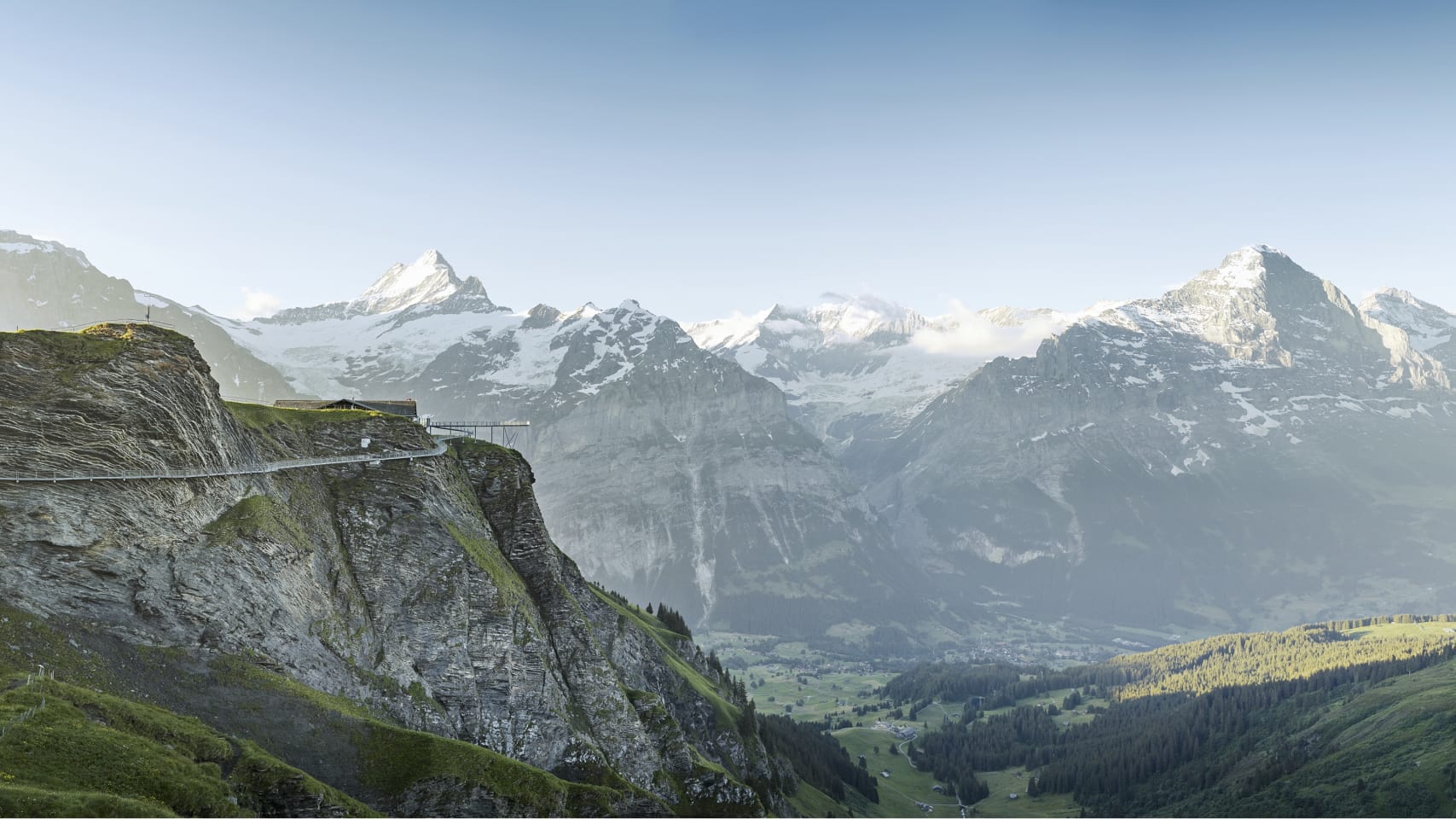 當你來到菲斯特,懸崖天空步道(First Cliff Walk)無疑是必須體驗的景點之一。這是一條修建在懸崖邊緣的金屬步道,當你踏上那懸空的橋段時,眼前的景色讓人屏息。最終抵達觀景平台,眼前的艾格峰(Eiger)、僧侶峰(Mönch)和少女峰(Jungfrau)將以其雄偉壯麗震撼你的心靈。